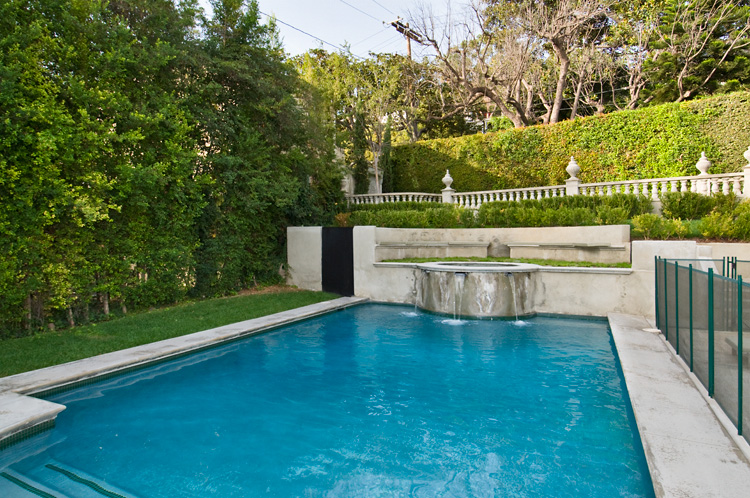The home of designer Barbara Barry exudes elegance from top to bottom.  The manicured grounds of 2401 Bowmont Drive provide the perfect setting for an oval pool and hot tub.  The architecture compliments the European style gardens rather than competing with it.