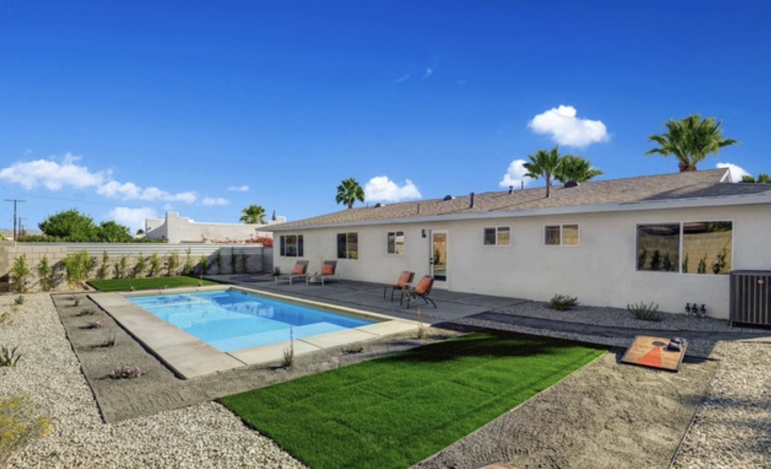 Completely renovated and reimagined mid-century modern pool home. Celebrate Quintessential Palm Springs with a brand new pool, jacuzzi, tanning shelf, horse-shoe/corn-hole court, surrounded by all new low-maintenance landscaping and mountain top views. House is equipped with an open-concept custom kitchen, new HVAC, tankless water heater, Google Nest, new doors, energy efficient windows, LED- dimmer lighting throughout and more. This is a perfect buy for a rental/airbnb type buyer or enjoy as an owner-user at a great value in a neighborhood on the rise!