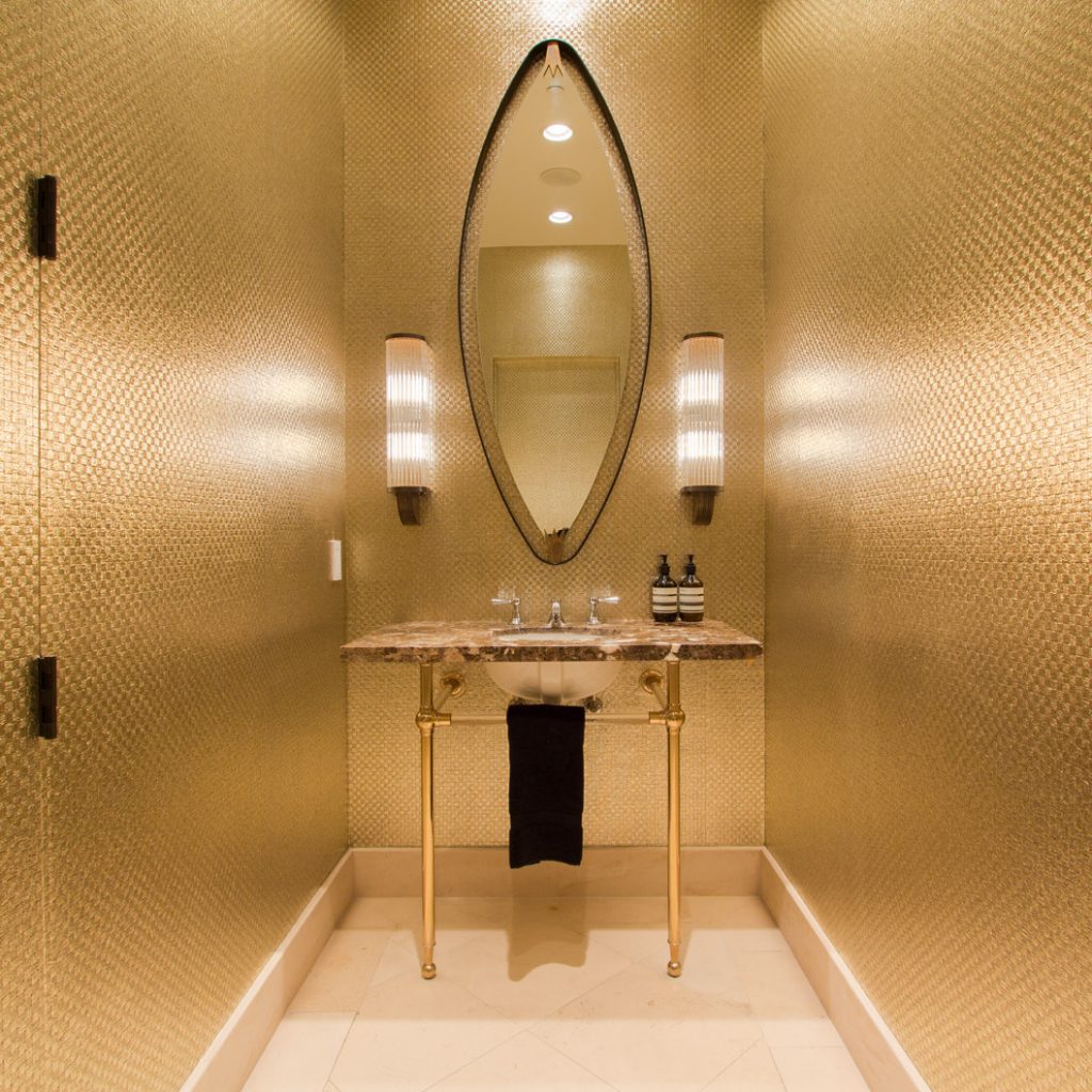 A textured wall can transform a small powder room like the one in this Hollywood chic home above the Sunset Strip. Woven fabric was applied to the wall and overlaid with a substance containing actual gold particles. The gold adds the glam while the textured surface adds depth. That is one show stopping wall treatment! You can also look for paintable textured wall paper to get that textured look in any color that your heart desires.